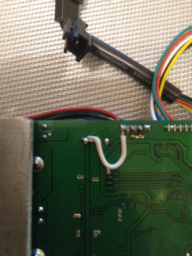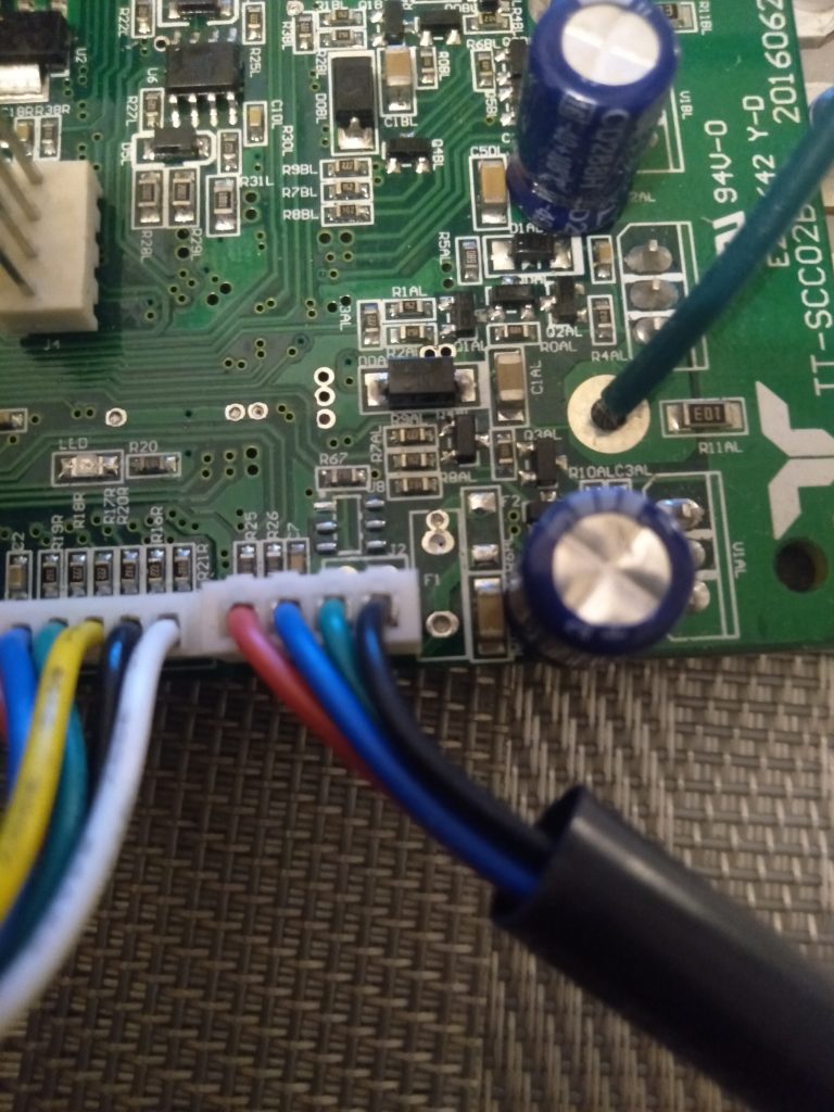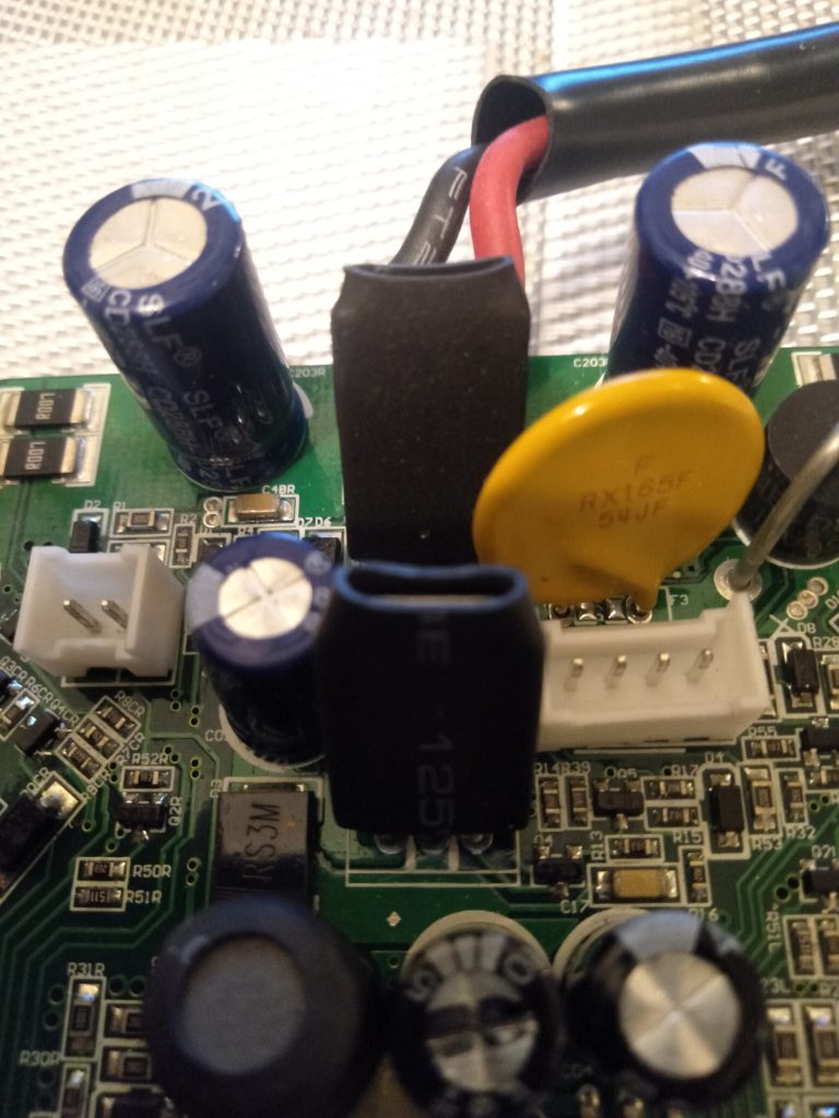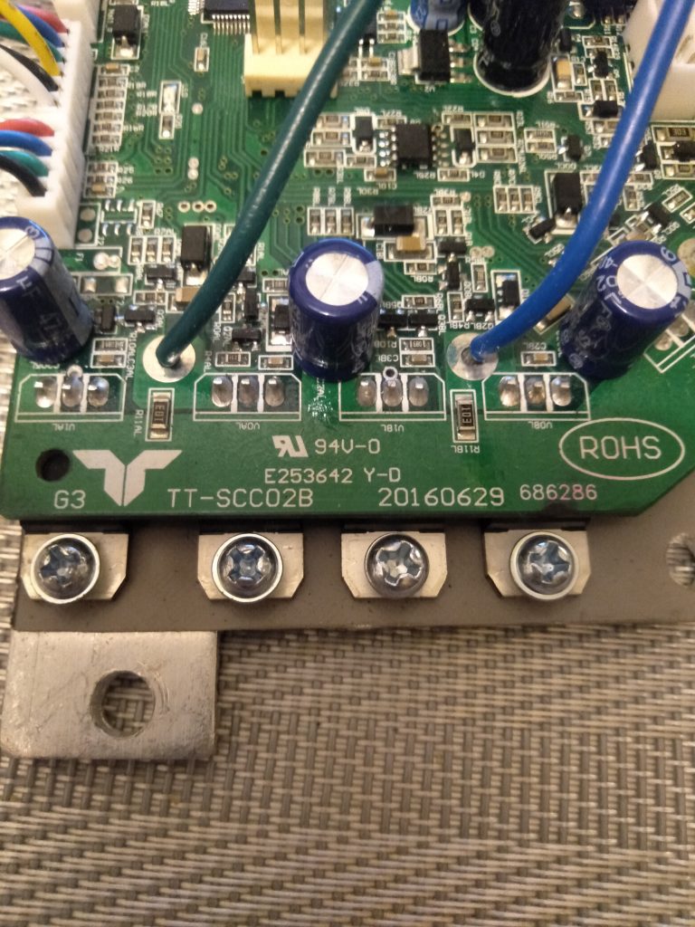 Еще один предохранитель F1 стоит правее правого порта управления (на фото он уже удален). Через него на красный провод порта приходит 42В, а не 13В, как у большинства контроллеров.
